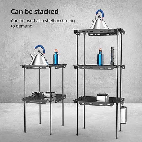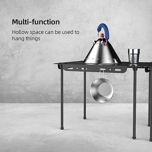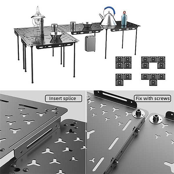 This is a multi-functional camping portable table with customizable cutout patterns. We can make any graphics with laser technology for your requirement. Thanks to these hollow spaces, it can be used to hang some essentials. Moreover, the table is super quick to assemble. All you have to do is rotate the four legs into the joints. Multiple chairs can be stacked up because of their unique construction and can be used as a shelf according to demand. There are two splicing methods inserting splice or fixing with screws.