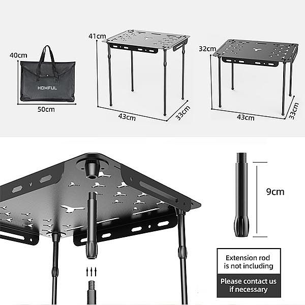 Made from high-quality aluminum alloy with oxidation surface treatment, low-profile surface, and looks much more stylish. Besides, it is rustproof and easy to clean. This multi-functional camping portable table size is 43x33x(32-41)cm, it has two heights for you to choose from. The 9cm extension rod can be assembled to the joints to achieve the purpose of increasing height. 40x50 cm after folding, it weighs only 1.5kg. Hereby, it has a compact size and portable mode. It can also hold up to 30kg even though the thickness of the desktop is only 2mm. Ultralight camping table packs up into the shoulder carry bag which reduces your outdoor travel burden. The carry bag fabric is the same as the chair fabric 600D Oxford, durable. About the package size, it can be loaded around 6600pcs in one 40HQ.