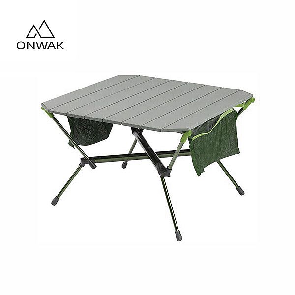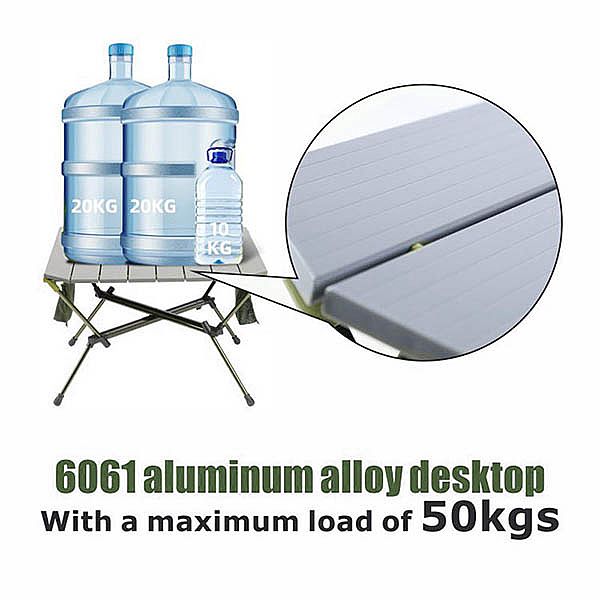 This folding table is different from others; it can be made of all metal materials. The desktop and the support frame are both made of metal with a surface treatment that has an anodized appearance that is shiny and exquisite. There are eight metal plates on the desktop; we can build the emblem on the primary plate with a silkscreen or optical device marking. And on the two sides, we may see two storage bags; these area units are created with mesh, and we will place our phone, book, or others.