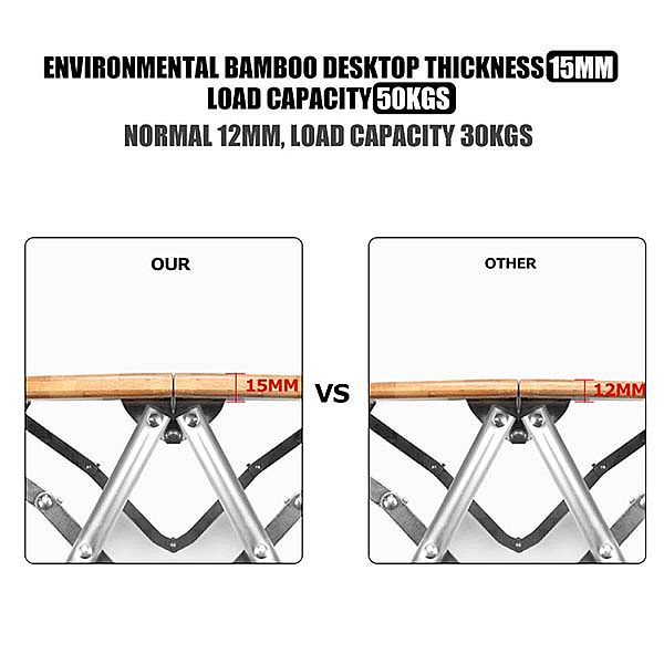 What is the fabric of this table? For this tabletop, we tend to use bamboo. The thickness is 1.5 mm, which is sturdy. Most bamboo tables on the market are only 1.2 mm thick. And then, we apply another coat of paint to protect the desktop. It comes into contact with nothing sharp or swishy. We tend to use lightweight aluminum. There are two frames for the frame. Supported by the fabric, our weight is 3.5 kg for this table.